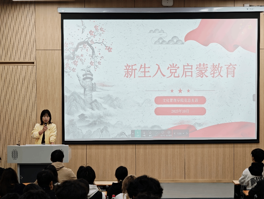 2025年10月17日中午,武汉传媒学院文化管理学院在大悟校区1202教室举办2025级新生入党启蒙教育培训。学院党总支副书记赵洲舟、组织委员武思雨联合主讲,面向新生开展思想淬炼,引导青年学子扣好入党“第一粒扣子”。