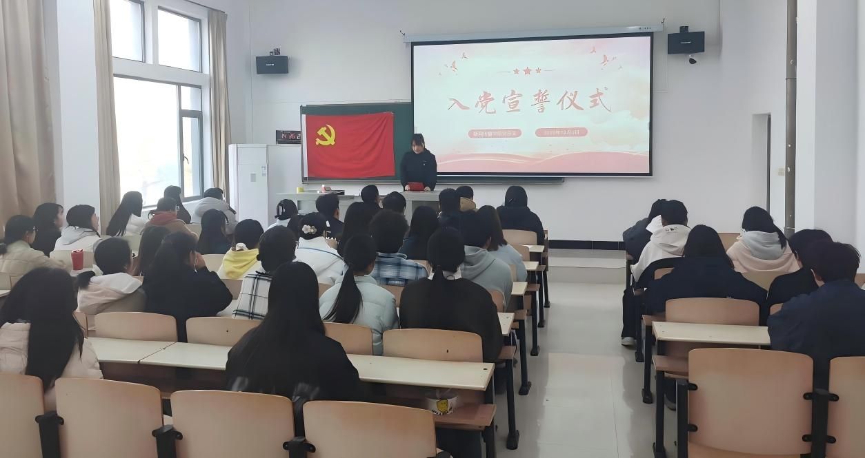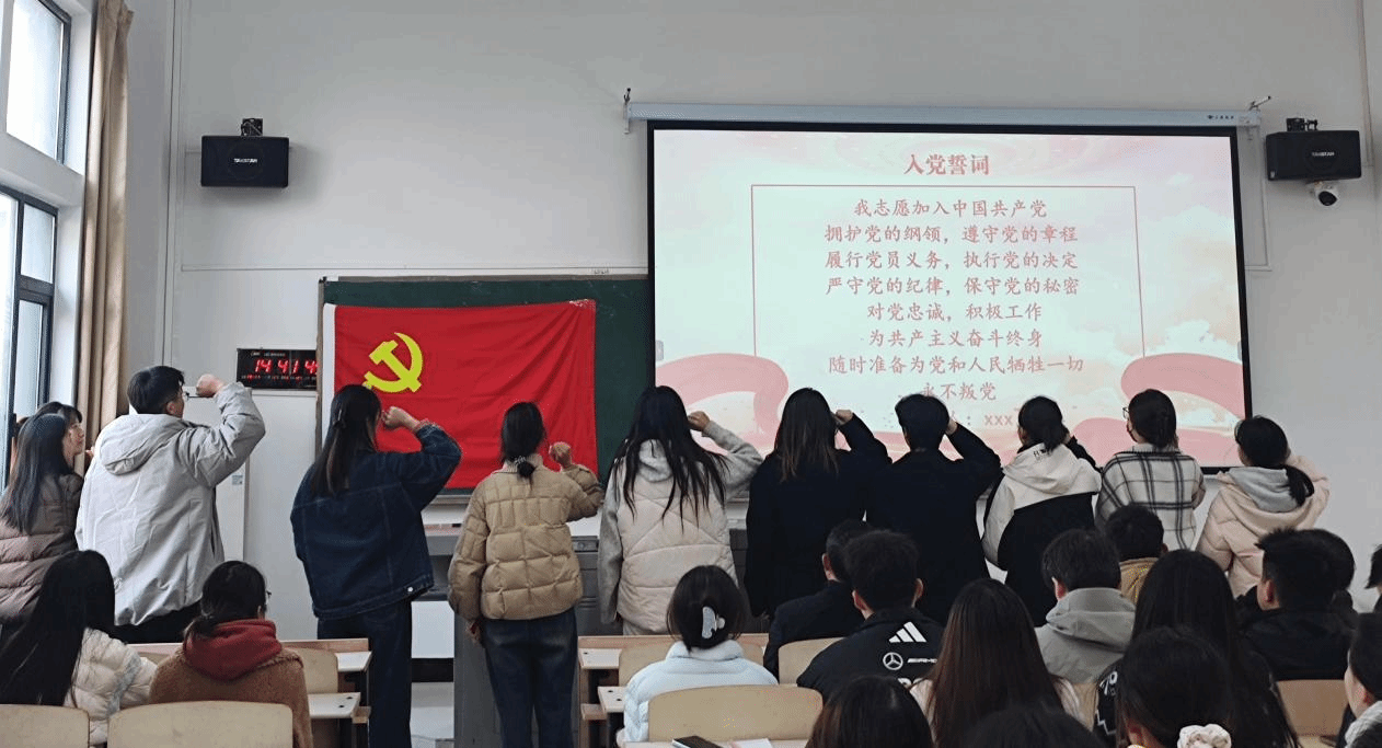 仪式在雄壮的《国际歌》声中拉开帷幕。学生党支部书记刘田田、黑思博为新党员佩戴党员徽章、颁发中国共产党章程。面向鲜红党旗,两名支部书记作为领誓人,带领全体新党员高举右拳庄严宣誓:“我志愿加入中国共产党……”铿锵誓言响彻会场,表达了新党员为共产主义事业奋斗终生的坚定决心。